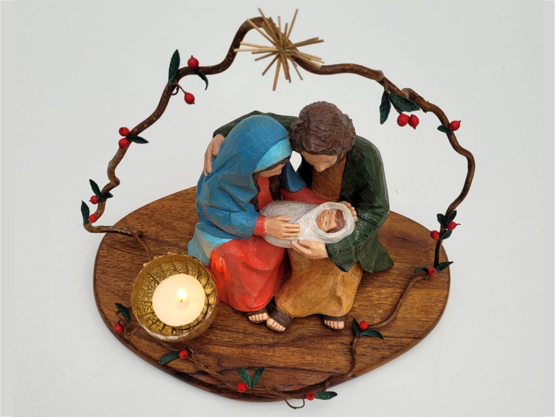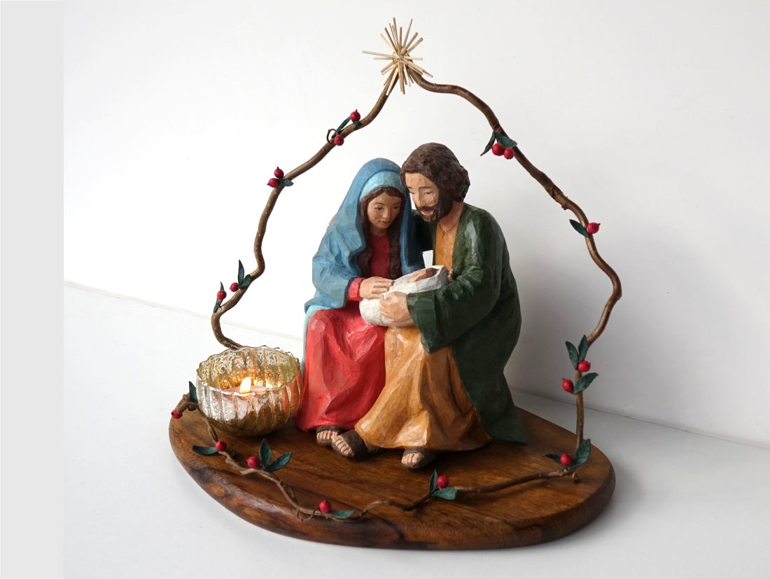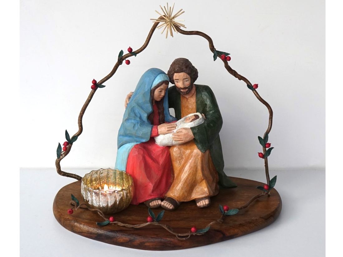 Für den Schleswiger Dom habe ich mich mit dieser Skulptur für die Gestaltung der neuen krippe beworben, aber die Wahl fiel auf eine abstrahierte Krippe mit Bronzeplastiken. daraufhin habe ich einen schönen Rahmen aus einem Haselnusszweig und getrockneten, roten Beeren und Blättern aus Leder gefertigt… so ist die Familie schützend eingerahmt und könnten pünktlich zur Weihnachtszeit Einzug in ihr neues zu Hause halten.