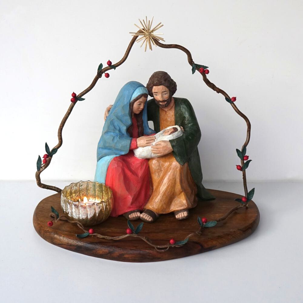 Für den Schleswiger Dom habe ich mich mit dieser Skulptur für die Gestaltung der neuen krippe beworben, aber die Wahl fiel auf eine abstrahierte Krippe mit Bronzeplastiken. daraufhin habe ich einen schönen Rahmen aus einem Haselnusszweig und getrockneten, roten Beeren und Blättern aus Leder gefertigt